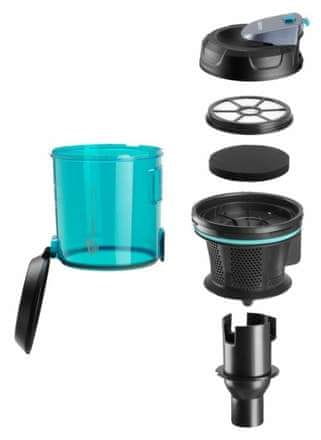 Systém cyklónu spočívá v odstředivé síle působící při rotaci vysávaného vzduchu na nečistoty a jejich následné odstředění do sběrné nádoby. Hlavní výhodou cyklonových vysavačů je absence sáčků a jejich neměnný výkon při vysávání. Navíc během úklidu nedochází k víření prachu. Omyvatelný HEPA filtr 13 zachytí i ty nejjemnější prachové částice, takže je vhodný i pro alergiky a astmatiky.