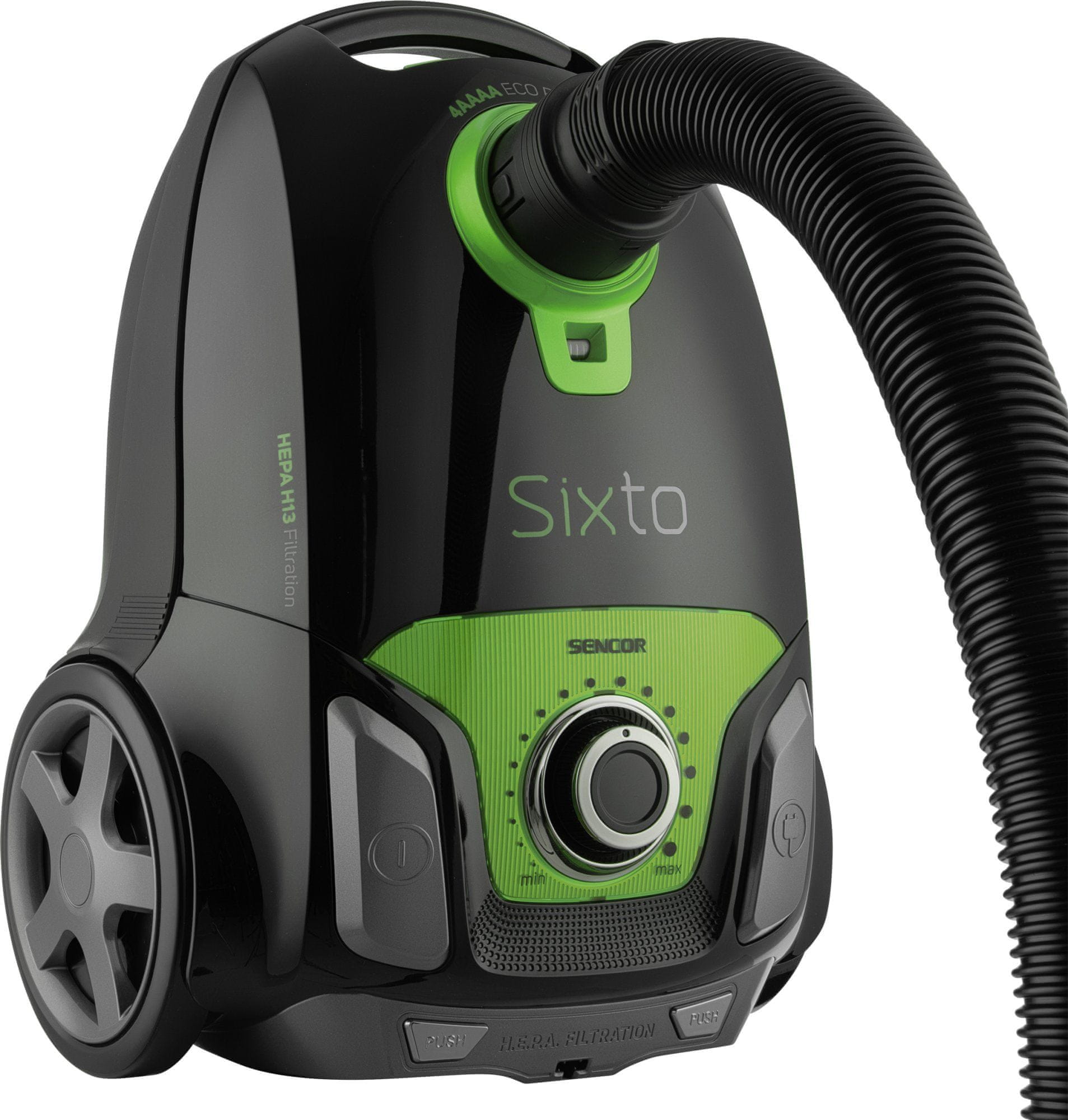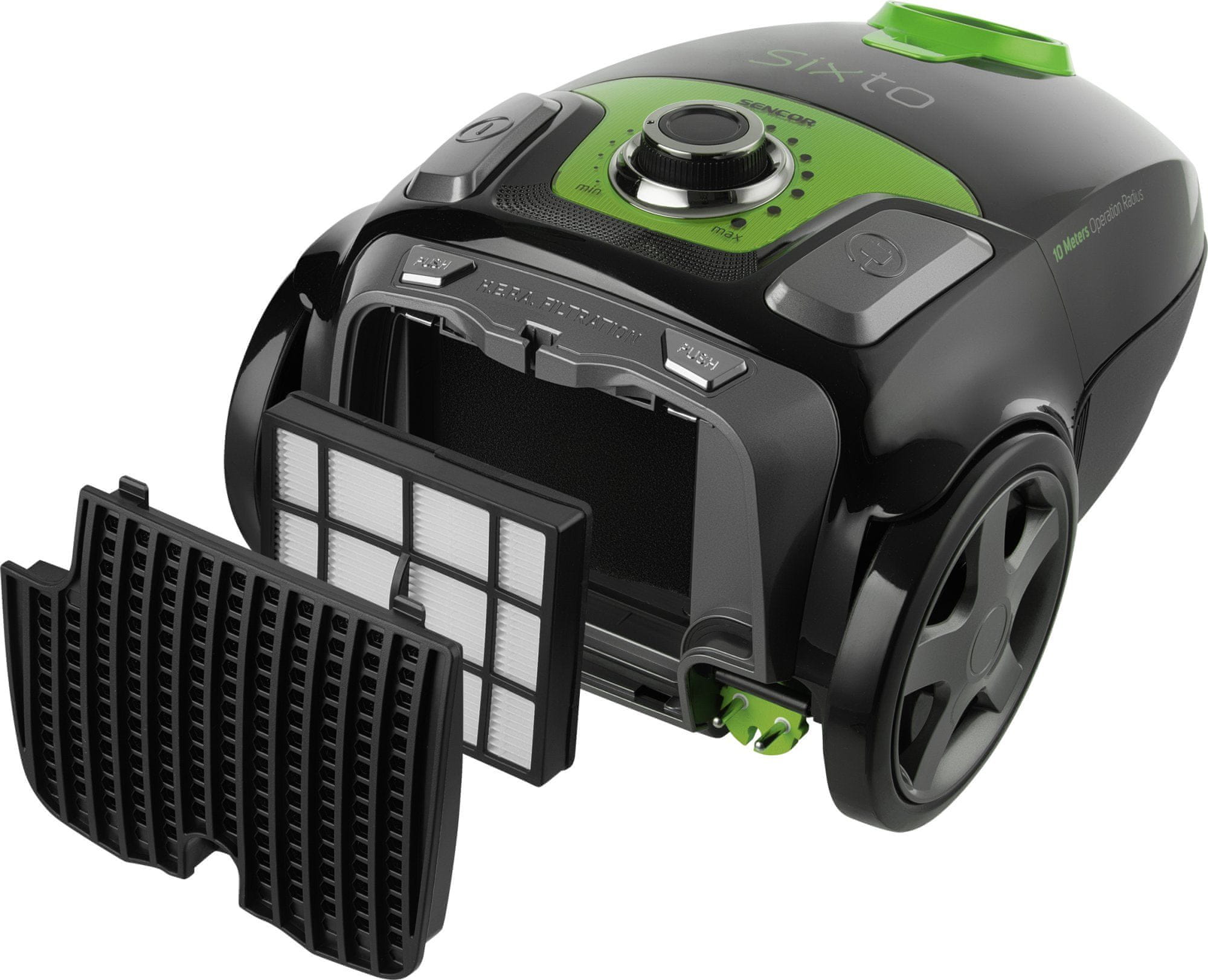 Usisavač s vrećicom s metalom teleskopska cijev XXL s produženom duljinom uz jednostavno podešavanje ergonomska radna visina. SENCOR SVC 6900GR-EUE3 je opremljen s filterom HEPA H13, pogodan za alergičare. Tehnologija Silence osigurava tiho usisavanje uz razinu buke od samo 75 dB.