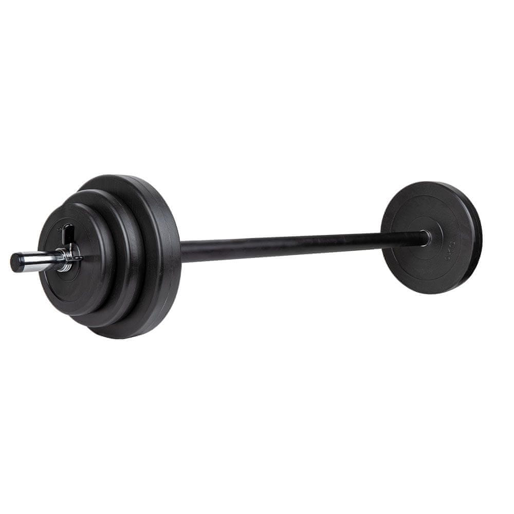 Set uključuje gumom obloženu ravnu šipku (2,5 kg) dužine 130 cm i promjera 30 mm, koja osigurava udobno i sigurno držanje tijekom vježbanja. Uz šipku dolaze utezi u tri težine (2 × 1,25 kg, 2 × 2,5 kg, 2 × 5 kg) te dva osigurača za stabilno pričvršćivanje.