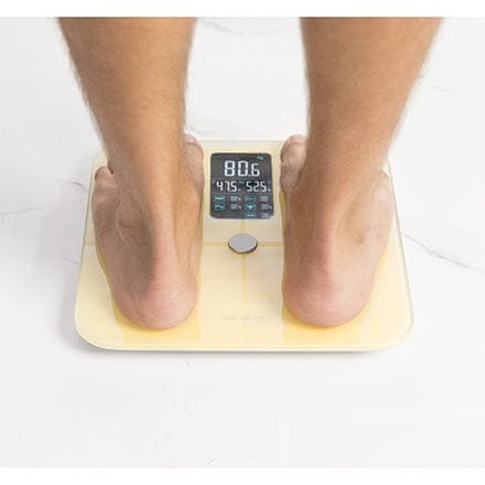 Bez obzira pratite li svoju težinu po preporuci liječnika ili za vlastite ciljeve, svakako ćete smatrati korisnim praktičnog pomoćnika poput osobne vage. Dijagnostička vaga CECOTEC prikazuje potpunu analizu vašeg tijela. Prati vaše tjelesne karakteristike, posebno količinu tjelesne masti, mišićne mase, sadržaja vode, koštanog tkiva, BMR i mjerenje otkucaja srca. Njene moderne funkcije naglašava atraktivan zaslon s pozadinskim osvjetljenjem. Proizvođač je mislio i na sigurnost, pa je na dno dodao gumene nožice koje sprječavaju klizanje. Površina za vaganje izrađena je od visokokvalitetnog materijala, poput stakla. Maksimalna nosivost proizvoda je 150 kg s točnošću mjerenja od **100 g. **Originalni dizajn osobne vage CECOTEC nadopunjuje žuta boja.