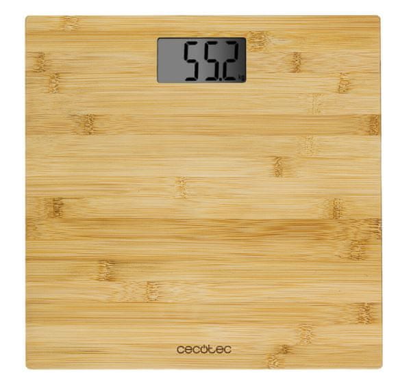 Digitalna osobna vaga Cecotec Surface Precision 9300 Healthy impresionirat će vas daskom veličine 30 × 30 cm koja je izrađena od bambusova drveta s organskim certifikatom. Opremljen je tehnologijom FourPrecision koja osigurava točno mjerenje težine uz pomoć četiri senzora. Nosivost vage je 180 kg. Mjeri s točnošću od 100 g i prikazuje mjerenja na prozirnom LCD zaslonu u kg ili lbs.