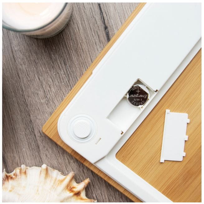 Vaga se uključuje automatski kad na nju nagazite i isključuje se kad se s nje spustite. Za rad je potrebna 1 CR2032 baterija uključena u komplet. Indikator statusa baterije upozorit će vas kada treba zamijeniti. Indikator će vas također upozoriti kada je vaga preopterećena. Četiri noge SafeGrip, izrađene od plastike, poboljšavaju prianjanje i doprinose sigurnoj uporabi. Uz vagu je uključena i mjerna traka.