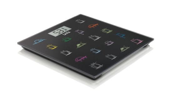 Vaga ima ploču od kaljenog stakla debljine 6 mm, zaigran motiv, čitljiv LCD zaslon, automatsku aktivaciju „Auto-On“, automatsko isključivanje s vremenskom odgodom, nosivost 180 kg i točnosti prikaza 100 g.