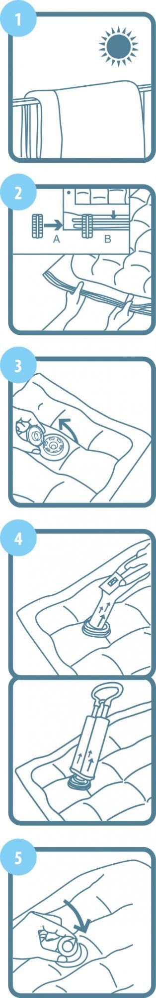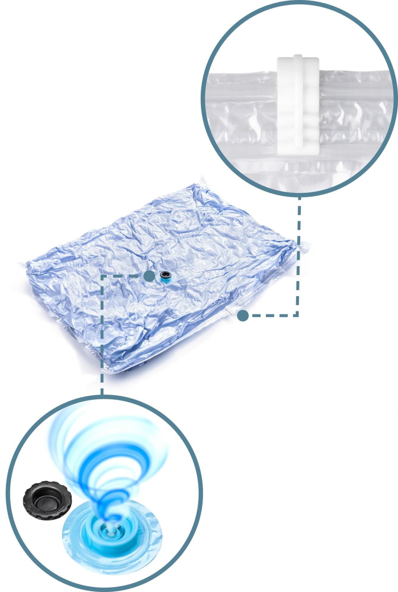 Uporaba: Položite vreću na tvrdu površinu. Otvorite ju i stavite stvari koje želite pospremiti, a zatim čvrsto zatvorite klizač. Stvari moraju biti barem 5 cm odaljene od klizača. Otvorite poklopac ventila i s usisivačem izvucite zrak.. Preporučljivo je izvući između 70 i 80 posto zraka. Zatvorite poklopac ventila. Držati dalje od djece, plamena, topline i oštrih predmeta.