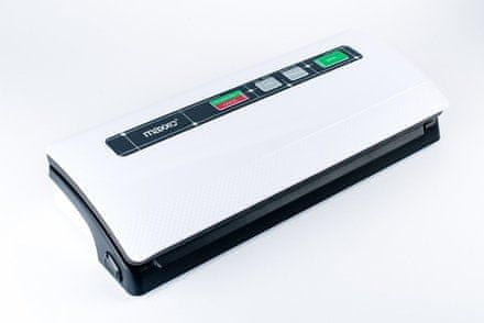 Maxxo VM5000 vakuumski aparat za zatvaranje hrane s povećanim performansama. Jednostavno automatsko korištenje samo pritiskom na gumb. Gumb za brzo i čvrsto zatvaranje vakuumskih rola. Funkcija prekida usisavanja zraka za vakuumiranje mekih namirnica, sprječavajući deformaciju hrane. Poseban način rada za vakuumiranje vlažnih namirnica. Brzo vakuumiranje s TURBO načinom usisavanja. Sigurnosne protuklizne pločice za sprječavanje pomicanja po kuhinjskom pultu. Prostor za pohranu kabela za napajanje na dnu vakuumskog aparata Priključak za vanjsku usisnu cijev za vakuumiranje hrane u posebnim limenkama, vrećicama i bocama (cijev nije uključena) Revolucionaran način skladištenja hrane u vakuumu (tj. bez zraka) produžit će joj rok trajanja do 5 puta. Zahvaljujući vakuumiranju, hrana zadržava svoju prirodnu svježinu i kvalitetu. Pogodno za vakuumiranje hrane i naknadnu modernu pripremu Sous-vide metodom kuhanja u precizno temperaturno kontroliranoj vodenoj kupelji. Izlaz kompresora 12l/min; 800mbar. Težina: 1,3 kg Maksimalna širina rola i folija – 300 mm Dimenzije: 360×150×90 mm Napajanje Usisavanje zraka iz vrećica i rola, zavareno visokokvalitetnim i jakim zavarivanjem. Paket uključuje: 10 vrećica (5 kom 22×30 cm, 5 kom 28×40 cm)