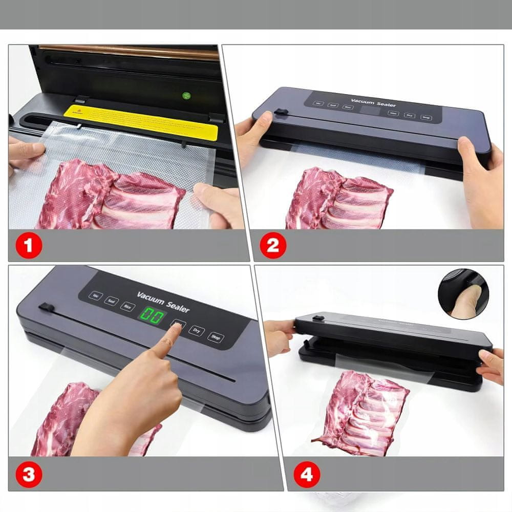 Jednostavna je za korištenje: stavite hranu u vakuumsku vrećicu, stavite je u vakuumsku zatvaračicu i pokrenite proces. Uređaj automatski usisava zrak i stvara čvrsto, hermetički zatvoreno brtvljenje.