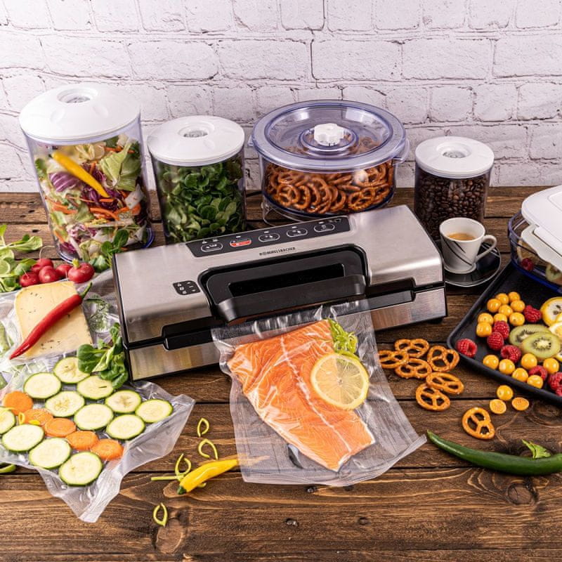 Ovaj snažni vakuumski aparat neophodan je u svakom kućanstvu! Ovaj model se lako otvara i zatvara jednom rukom bez ikakvog napora zahvaljujući udobnoj ručki. Integrirani pretinac za rolu folije s nožem za rezanje drži potrebnu rolu uvijek spremnom za upotrebu. Snažna pumpa osigurava vakuum do –0,8 bara u folijskim vrećicama, koje se zatim automatski zatvaraju jakim šavom u jednom potezu. S posebnom funkcijom za osjetljivu i vlažnu hranu, vakuumiranje je moguće automatski i sigurno; moguće je i ručno vakuumiranje i zatvaranje. To znači da se proces vakuumiranja može individualno prilagoditi svim vrstama hrane. Također je moguće vakuumirati posebne posude, tako da se čak i tekućine i vrlo osjetljiva hrana mogu nježno vakuumirati i dugo čuvati. Na taj način možete zaštititi i smrznutu hranu od opeklina smrzavanjem. Ova čvrsta vakuumska posuda prikladna je i za dugotrajnu upotrebu, što je čini savršenom za ribiče, lovce, kao i za poluprofesionalnu upotrebu u malim ugostiteljskim objektima. Vakuumsko pakiranje višestruko produžuje rok trajanja hrane – zbog čega VAC 385 ne bi trebao nedostajati u nijednom kućanstvu!