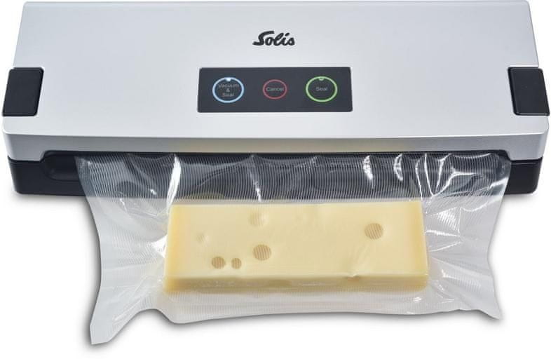 Solis Vac Smart vakuumska aparatura Solis Vac Smart je kompaktna vakuumska aparatura koja vam omogućuje pohranu hrane do 8 puta dulje. Savršeno je rješenje za one koji žele smanjiti bacanje hrane, uštedjeti novac i dulje uživati u svježoj hrani. Uređaj je savršen za svakodnevno kuhanje, kao i za pripremu za zamrzavanje ili sous-vide kuhanje. Prednosti: – Učinkovita vakuumska pumpa – tlak do –0,7 bara: Omogućuje brzo i učinkovito usisavanje zraka, osiguravajući hermetičko pakiranje za manje od minute. – 2 načina rada za različite potrebe: Automatsko vakuumiranje i zatvaranje i ručno trenutno zatvaranje – potpuna kontrola nad procesom pakiranja, čak i s osjetljivim proizvodima. – Protok zraka 8 l/min: Učinkovit rad čak i s većim količinama – idealno za tjedne pripreme. – Vakuumsko pakiranje mokre i suhe hrane: Kompatibilno s vrećicama i rolama širine do 30 cm i kompatibilno s vakuumskim posudama. Uklonjiva posuda za kapanje: Učinkovito skuplja višak vlage – čišćenje čini lakšim i higijenskijim. Kompaktno i kompaktno: Ugrađeno namatanje kabela i vertikalno spremanje – idealno za manje kuhinje. Iznimno jaki zavareni šav (2,5 mm): Jamči izdržljivo i sigurno pakiranje – bez rizika od curenja. Spremno za sous-vide: Pakirajte hranu za kuhanje na niskim temperaturama bez rizika od gubitka okusa ili arome. Vakuumsko pakiranje sa Solis Vac Smart – učinkovito očuvanje hrane. Solis Vac Smart je uređaj dizajniran za one koji žele maksimizirati svježinu svojih proizvoda. Zahvaljujući visokom vakuumskom tlaku (-0,7 bara) i brzom protoku zraka (8 l/min), uređaj brzo uklanja kisik iz vrećice, štiteći hranu od bakterija i plijesni. Savršeno je rješenje za čuvanje mesa, povrća, sireva i gotovih jela – i u hladnjaku i u zamrzivaču. Sigurno skladištenje – pogodno i za sous-vide kuhanje. Solis Vac Smart je više od pukog zatvarača – to je i alat za sous-vide kuhanje. Kompatibilan s vrećicama za kuhanje, možete biti sigurni da će vaša pakirana hrana zadržati svoj okus, teksturu i nutritivnu vrijednost. Osim toga, jaki šav od 2,5 mm sprječava curenje, što je ključno pri kuhanju u vodi. Jednostavno rukovanje i higijenski dizajn: Uređaj ima intuitivnu upravljačku ploču i samo dva načina rada, što ga čini idealnim za one koji tek počinju s vakuumskim pakiranjem. Higijenska ploča lako se čisti, a uklonjiva posuda za kapanje pomaže u izbjegavanju nereda prilikom pakiranja mokre hrane. Tehničke specifikacije: