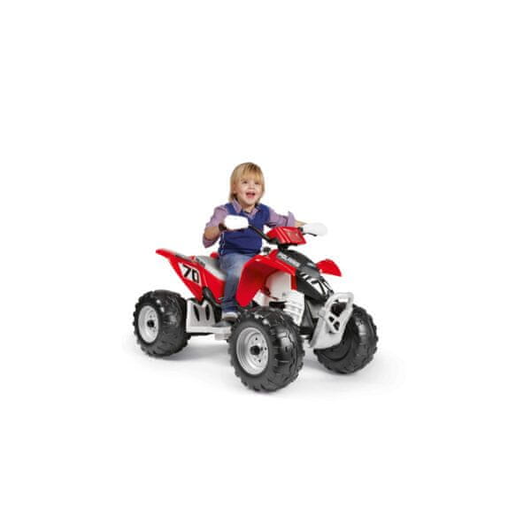 Riječ je o quadu iz snova, koji je licencirana kopija originalnog modela renomiranog američkog proizvođača. Vjerno oponaša sve oblike i značajke pravog terenskog vozila, što ga čini idealnim za mlade avanturiste. Veliki kotači s iznimnim prianjanjem i snaga dvaju pogonskih kotača omogućuju sigurnu vožnju na zahtjevnijem terenu, poput šljunka i neasfaltiranih površina. Sposobnost svladavanja nagiba do 10% pruža još više zabave.