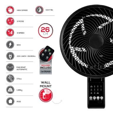 Ventilator nudi tri brzine rada, automatsku oscilaciju (80±5°), timer funkciju od 1 do 7,5 sati te podesivi nagib za optimalno usmjeravanje zraka. Upravljanje je dodatno olakšano IR daljinskim upravljačem, što omogućuje praktično korištenje iz bilo kojeg dijela prostorije.