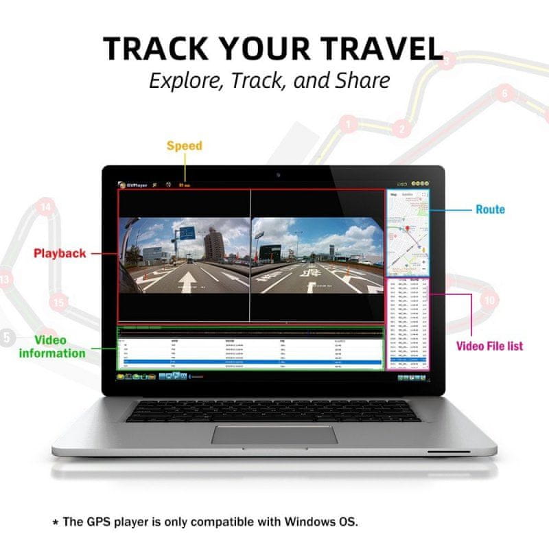 Druga vrlo korisna značajka sustava je GPS modul za pohranu GPS podataka (položaj i brzina) u svaki zapis. Tako možete lako pratiti svoj put izravno putem aplikacije.