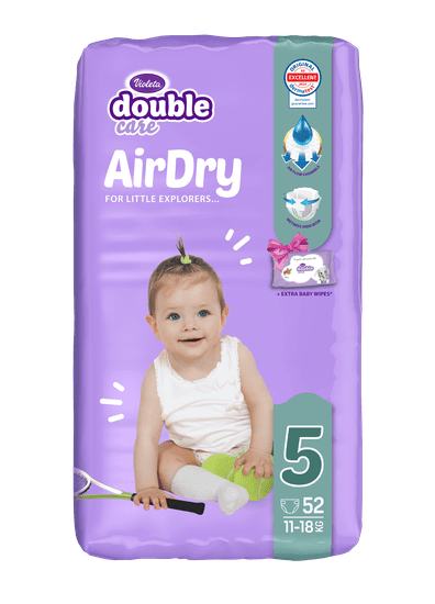 Dječje pelene Double Care izrađene su po najnovijoj tehnologiji Air Dry, a uz 52 pelena, u paketu je i pakiranje vlažnih maramica.