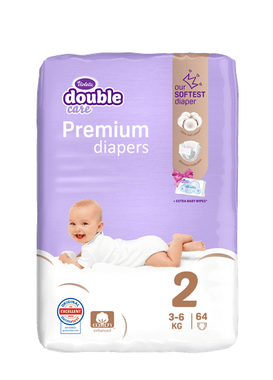 Dječje pelene iz linije Double Care izrađene su s najmodernijom tehnologijom Air Dry koja pružna iznimnu mekoću i udobnost. Uz 64 pelene veličine 2, u paketu se nalazi i paket vlažnih maramica Water Care.