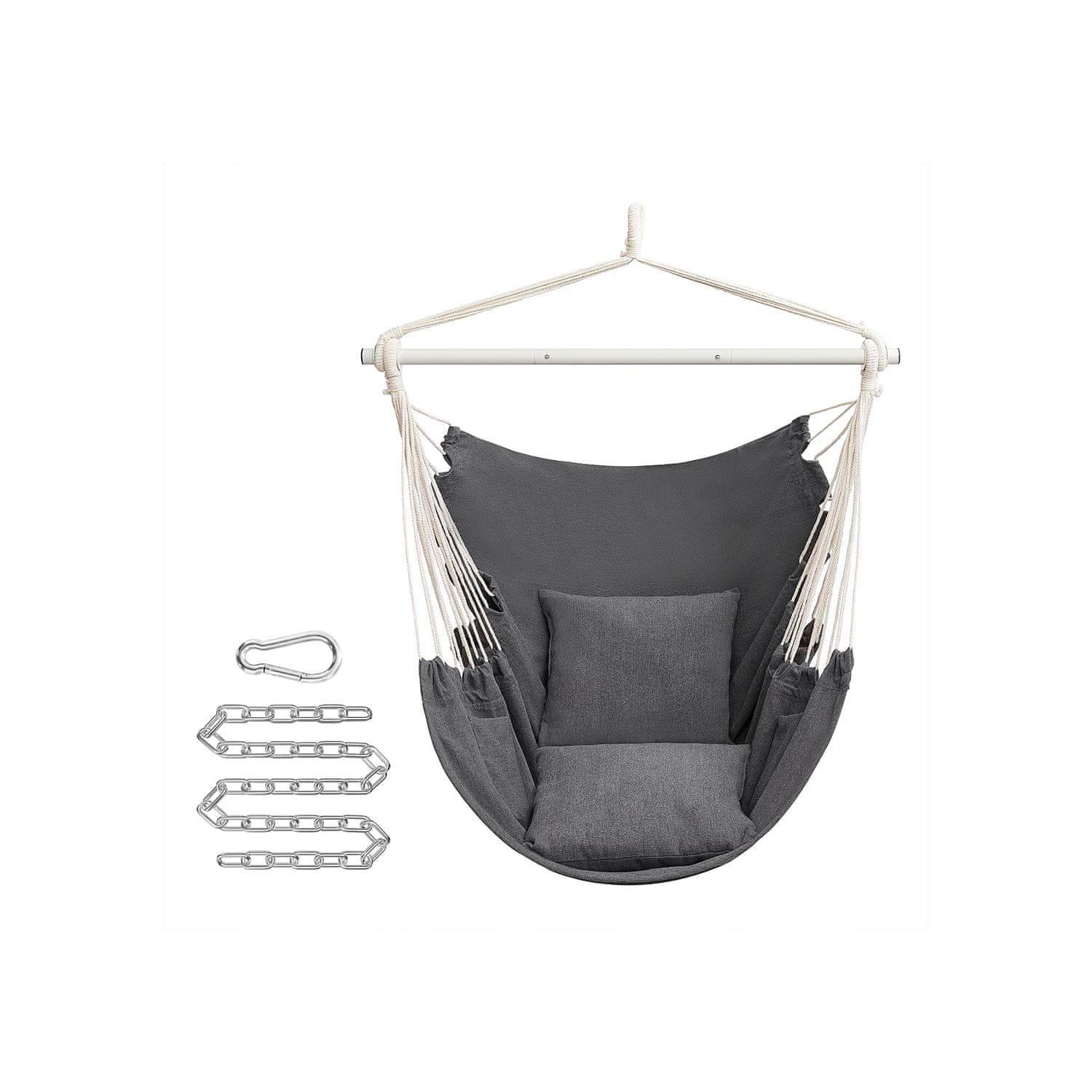 Uživajte u opuštajućoj udobnosti s ovom visećom stolicom savršenom za unutarnju i vanjsku upotrebu. Njegov čvrsti dizajn i uključeni jastuci čine je idealnom za odmor u dnevnoj sobi, spavaćoj sobi ili vrtu. Stvorite ugodan kutak gdje god je objesite.