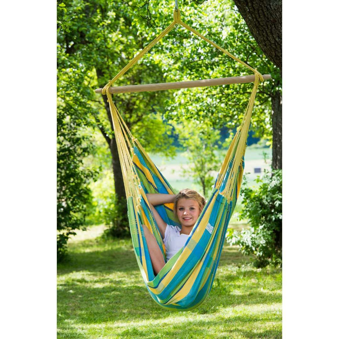 AMAZONAS Brasil XL je klasična brazilska viseća stolica za jednu osobu — “mlađi brat” modela XXXL Brasil Gigante. Zahvaljujući ekstra mekanoj tkanini, brojnim ovjesnim uzicama i stabilnoj FSC™ razupornoj šipki od njemačke bukve, pruža osjećaj “bestežinskog” opuštanja, ravnomjernu raspodjelu težine i dugotrajnu udobnost za korištenje u interijeru ili na otvorenom.