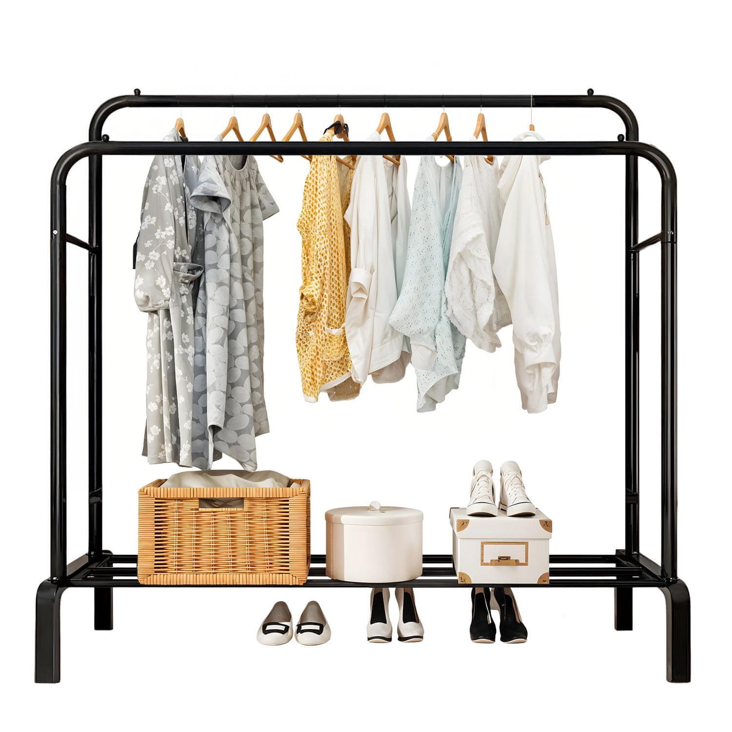 Trebate više prostora za odjeću i obuću? Vješalica za kapute ROCKY II savršeno je rješenje za hodnik, garderobu, spavaću sobu ili ured. Dvostruka šipka, izdržljiva čelična konstrukcija i moderna, mat crna boja čine ga savršenim za kućne i poslovne prostore.