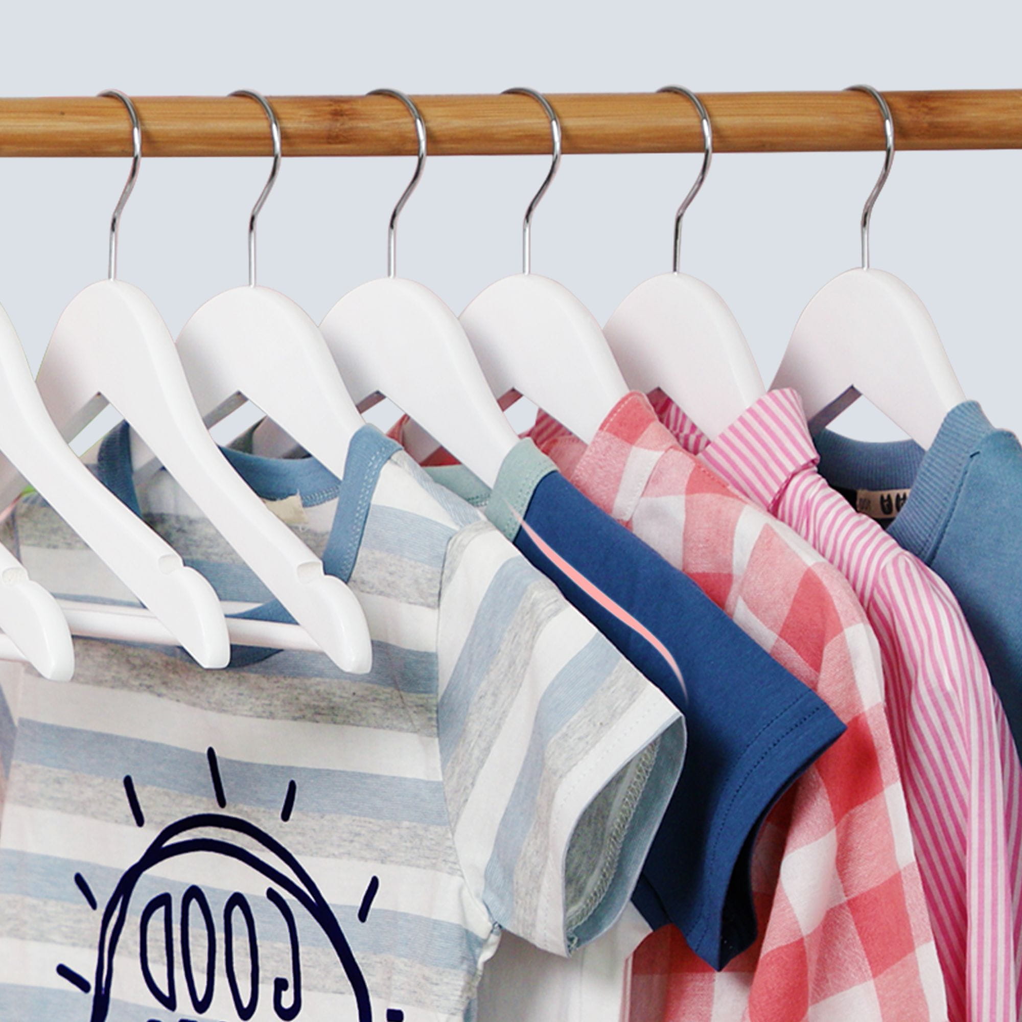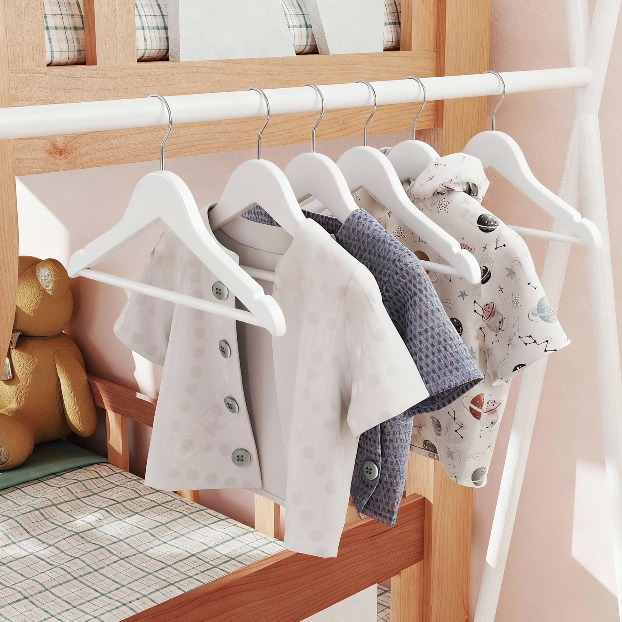 Ova drvena vješalica za djecu dizajnirana je za organizirano i uredno odlaganje dječje odjeće. Njena čvrsta konstrukcija i praktični utori sprječavaju klizanje odjeće, što je čini idealnom za svakodnevnu upotrebu u dječjim ormarima.
