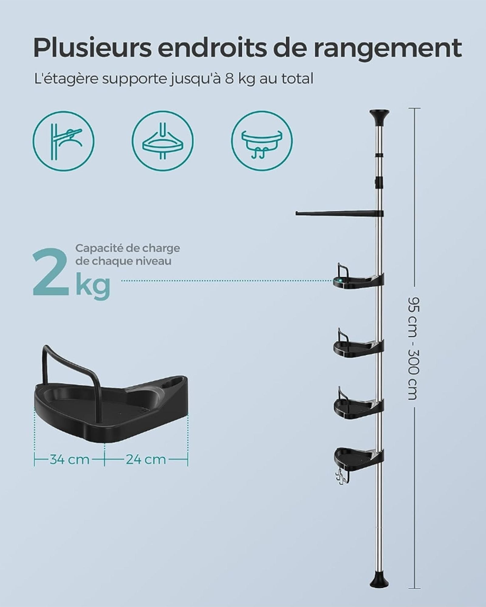 Songmics Polica za tuš 24x34x95-300 cm srebrna podesiva