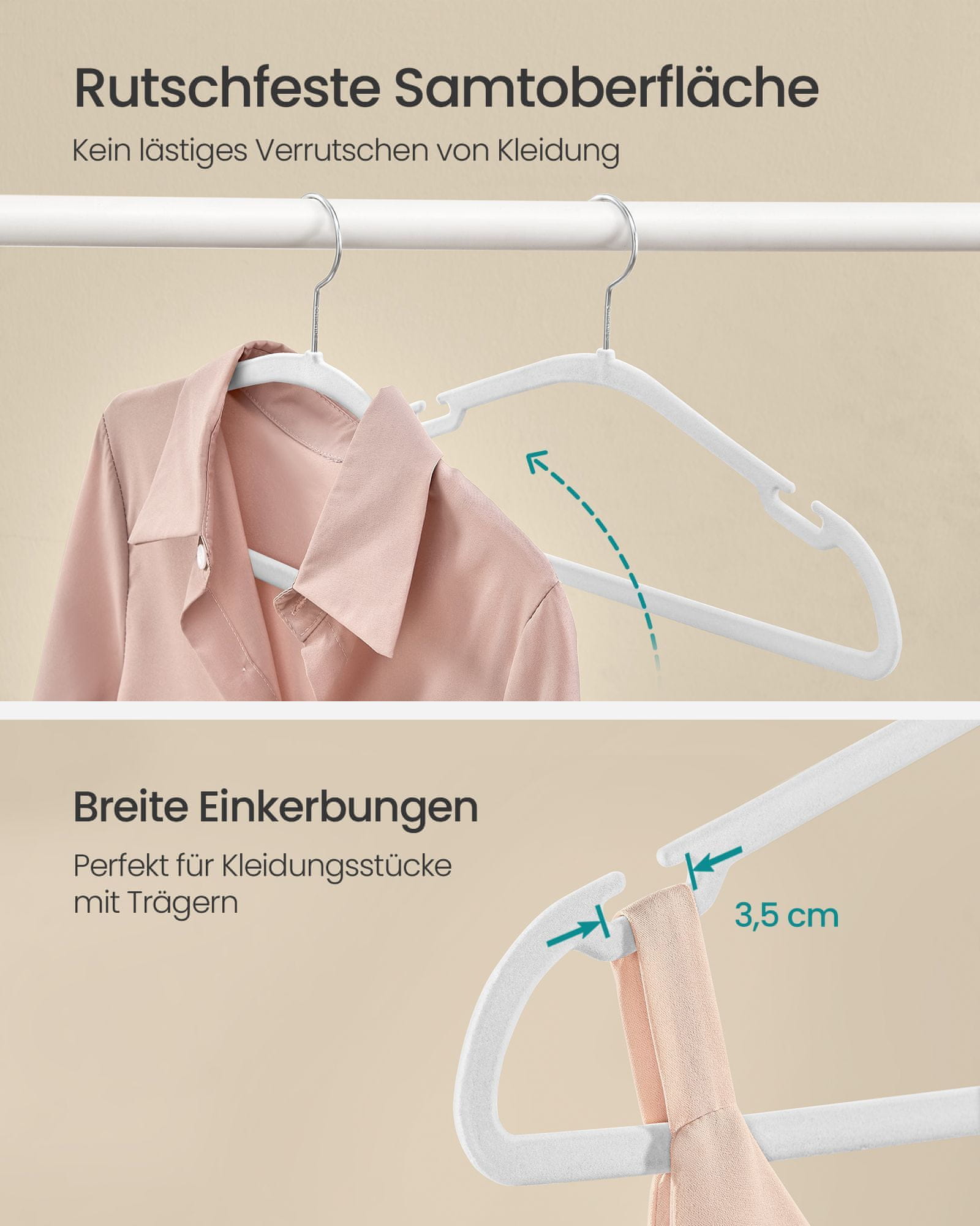 Ovaj set plišanih vješalica dizajniran je za održavanje vaše garderobe organiziranom uz zaštitu odjeće. Protuklizna površina i široki urez na ramenima sprječavaju klizanje odjeće dok je integrirana šipka idealna za vješanje hlača. Kuka koja se može rotirati za 360° i dizajn koji štedi prostor čine ove vješalice praktičnim dodatkom svakom ormaru.