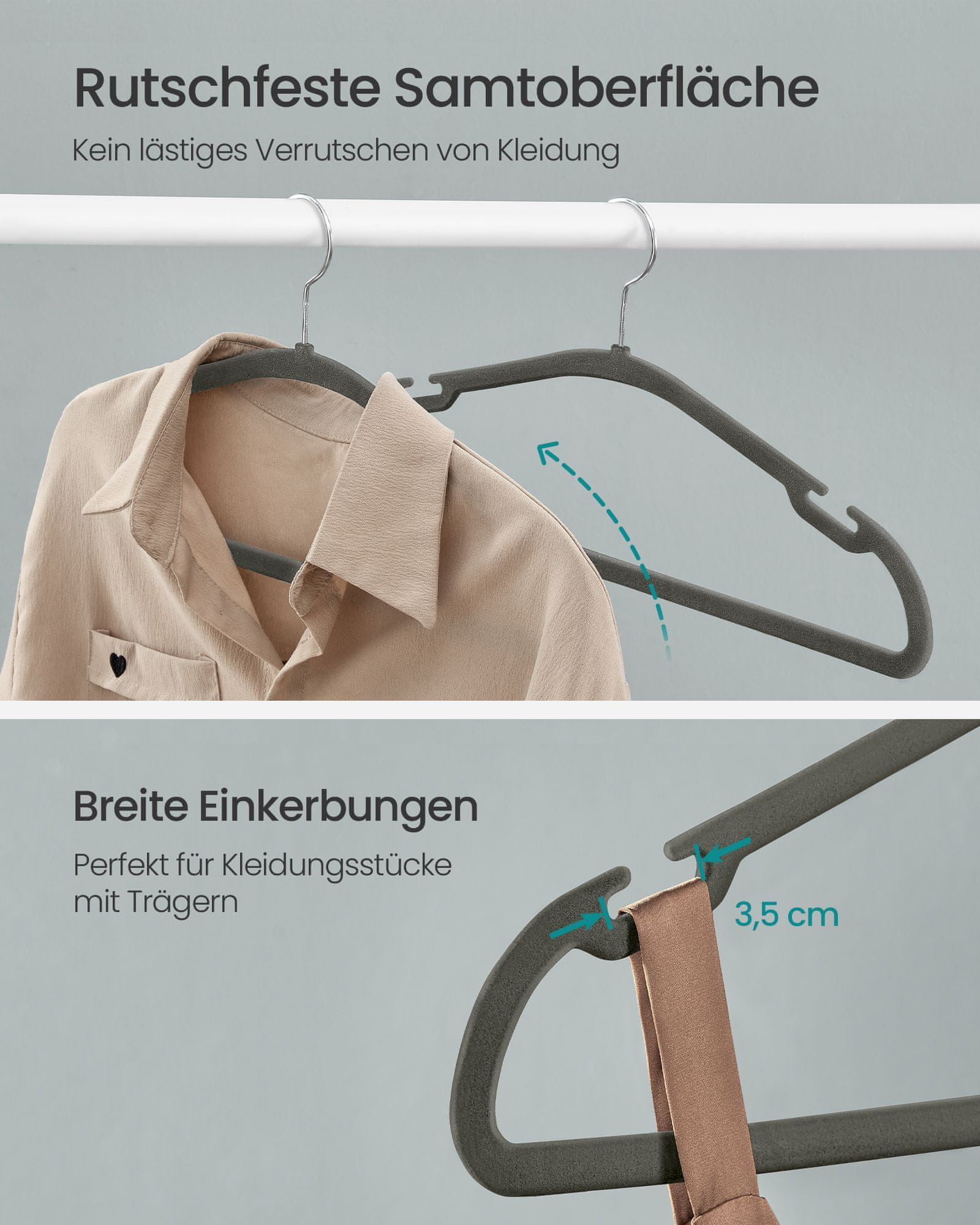 Ovaj set plišanih vješalica dizajniran je za održavanje vaše garderobe organiziranom i odjeće na mjestu. Protuklizna plišana površina i široki urez na ramenima pomažu spriječiti klizanje odjeće dok integrirana šipka omogućuje vješanje hlača. Dizajn koji štedi prostor i 360° rotirajući kukica čine ove vješalice praktičnima za svaki ormar.