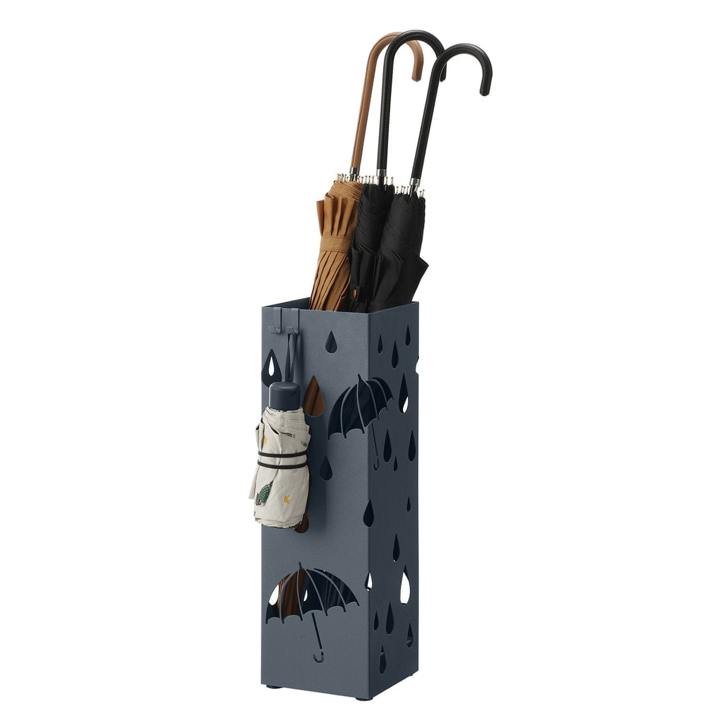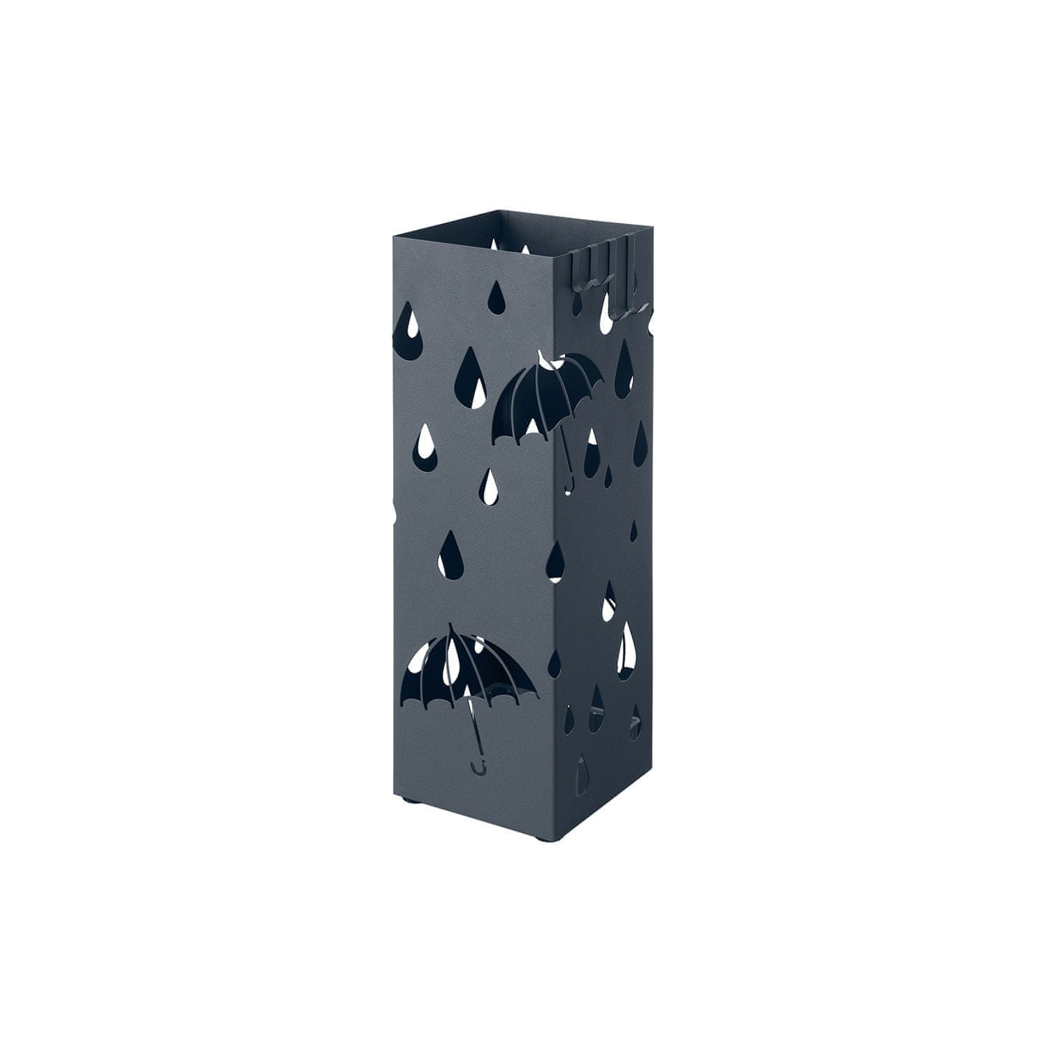 Ovaj metalni stalak za kišobrane dizajniran je za održavanje vašeg ulaza organiziranim i suhim pružajući posebno mjesto za kišobrane. Njegov kvadratni oblik i integrirana posuda za skupljanje vode pomažu spriječiti kapanje vode na pod dok uključeni kukice nude dodatni prostor za pohranu malih dodataka. Stalak je prikladan za kućnu i uredsku upotrebu kombinirajući funkcionalnost s modernim izgledom.