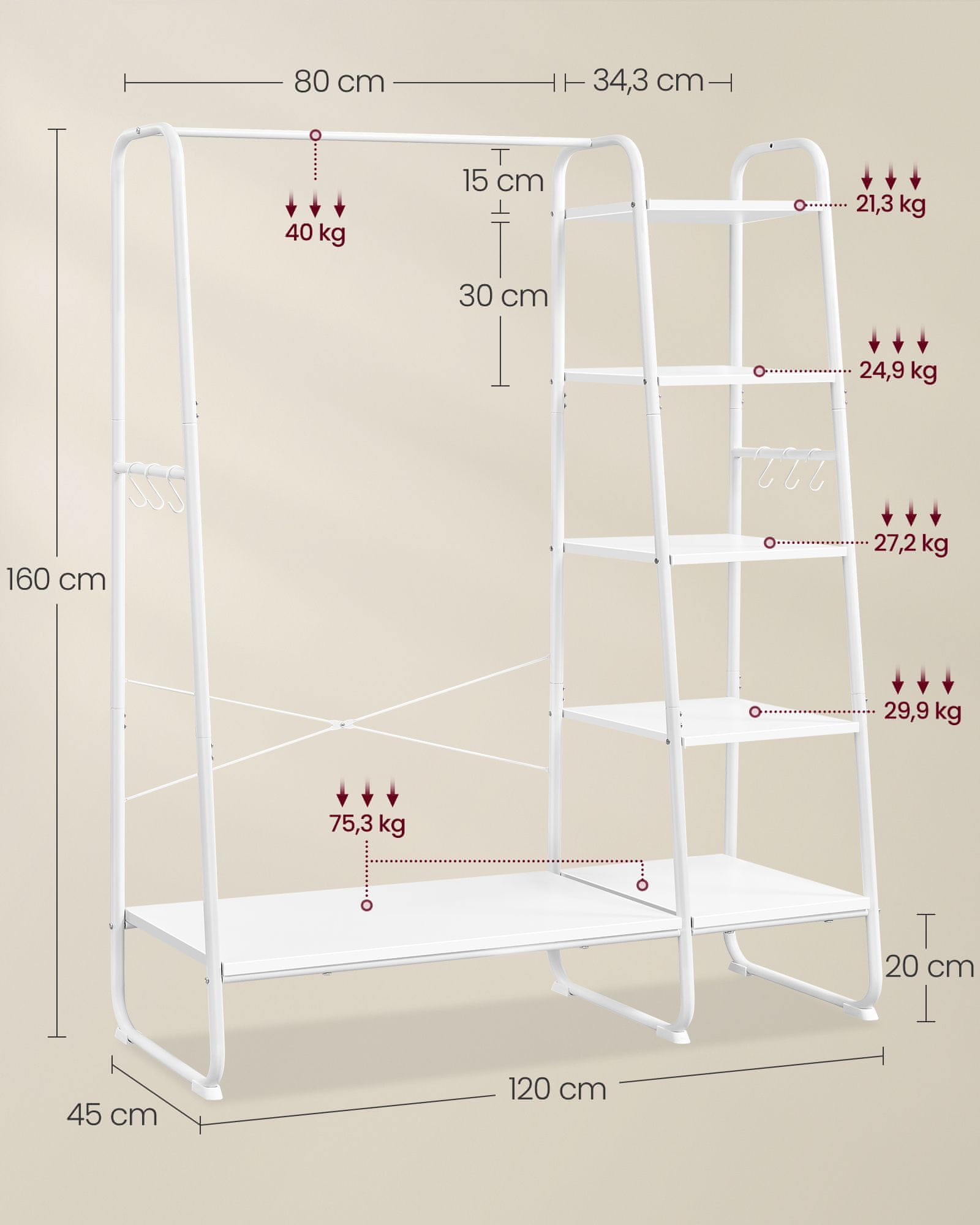 Ovaj stalak za odjeću nudi dovoljno prostora za vješanje odjeće i organizaciju cipela ili dodataka. Njegov otvoreni dizajn omogućuje jednostavan pristup vašim stvarima, dok čvrsta konstrukcija osigurava pouzdano skladištenje za vaš hodnik, spavaću sobu ili garderobu.