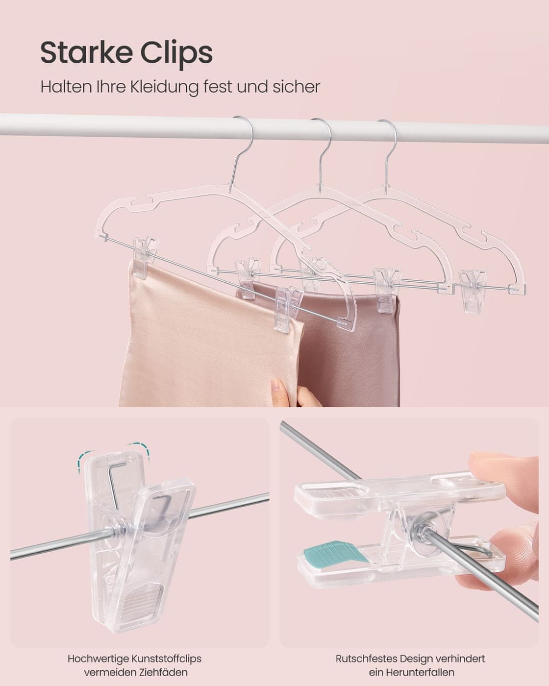 Ovi prozirni plastični vješalice idealni su za organizaciju hlača i suknji u vašem ormaru. Dizajnirani s širokim urezima za ramena i podesivim kopčama nude svestrane mogućnosti vješanja za različite odjevne predmete. Kuka koja se može rotirati za 360° osigurava jednostavan pristup i fleksibilno postavljanje.