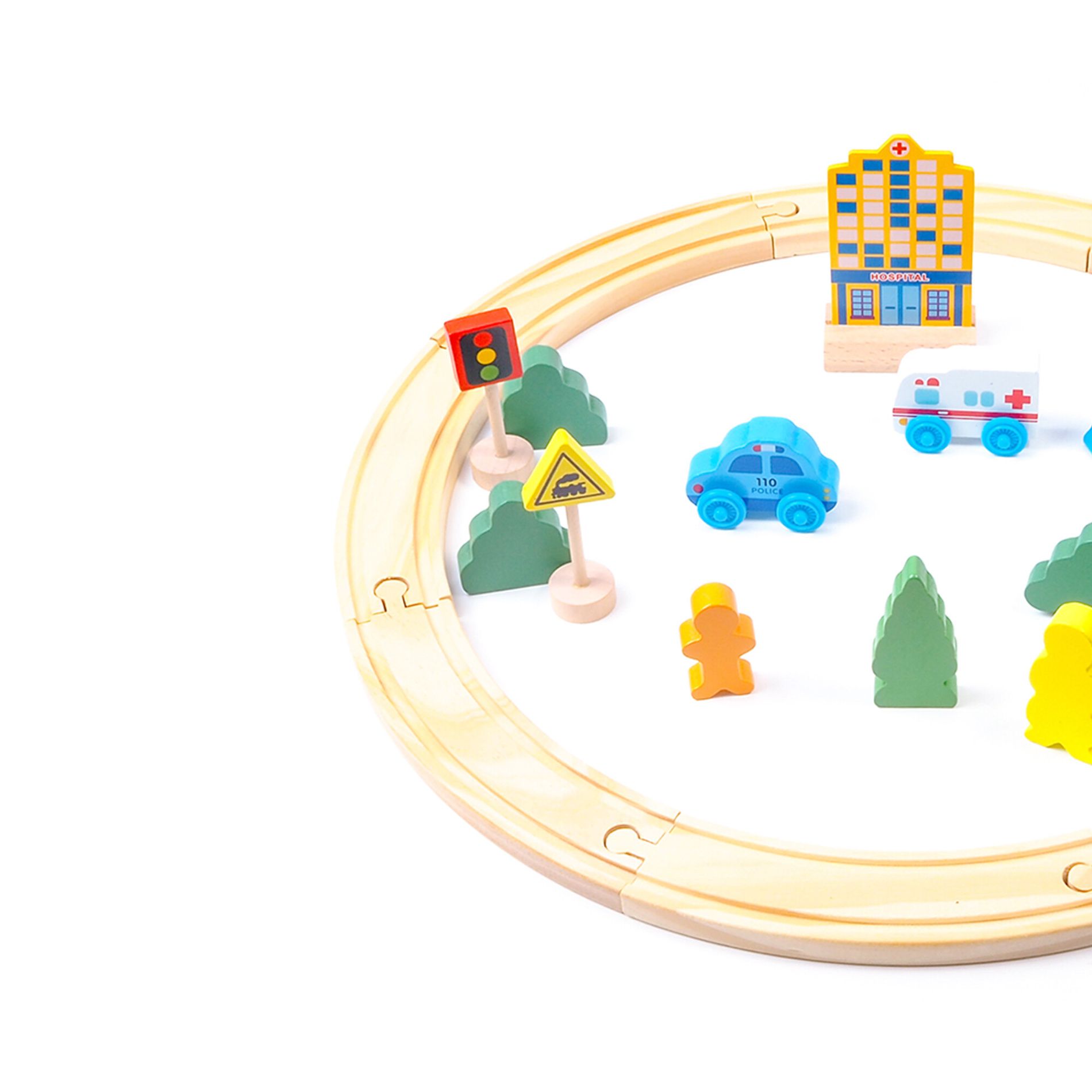 - Set sadrži – dijelove tračnica, vlakove, automobile, zgradu bolnice, figurice, prometne znakove i stabla