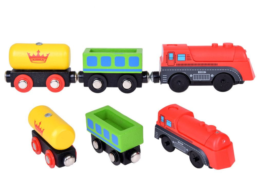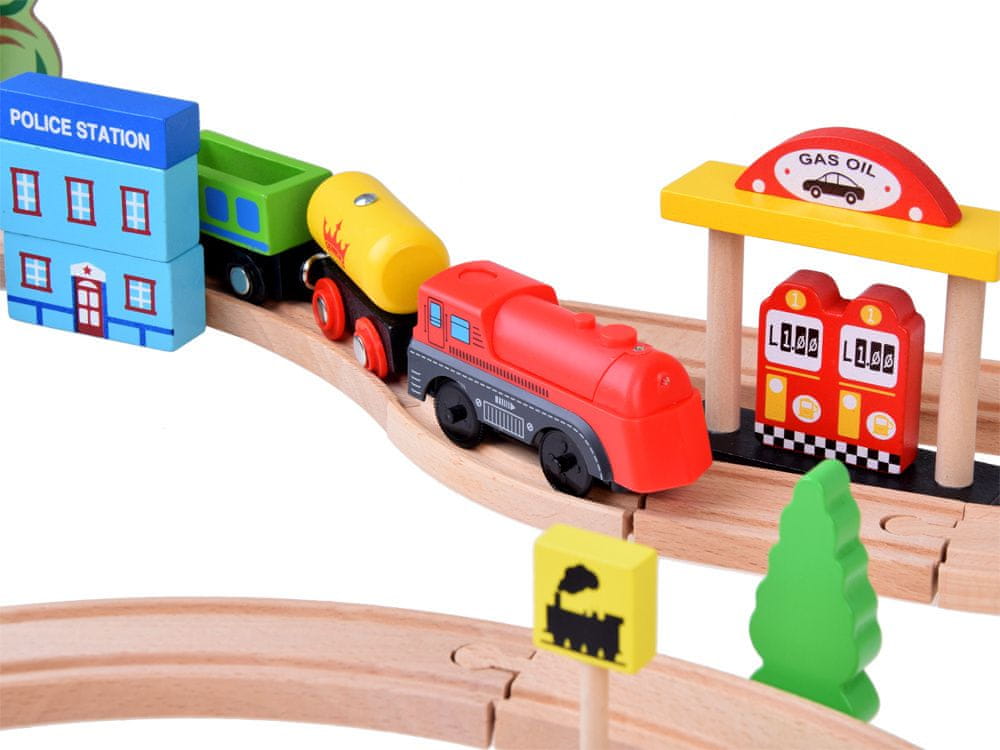 Drveni vlak je sjajna igračka za najmlađu djecu. Sastoji se od 80 elemenata i duljina staze je 360 cm. Svaki od njih bio je vrlo pažljivo i estetski izrađen od drveta s naglaskom na svaki mali detalj. Set je dizajniran s obzirom na najmlađu djecu, tako da su svi dijelovi šareni, prikladni za malu dječju ruku i izrađeni kako bi osigurali sretnu i sigurnu igru. Set se sastoji od vlaka s vagonima (povezanima magnetima), tračnica s prijelazom, figurica životinja i ljudi, prometnih znakova, stabala i grmlja, automobila, zgrada i benzinske postaje. Ovaj broj dijelova daje vašem djetetu mogućnost neograničene igre, možete se igrati s pojedinačnim dijelovima ili uz njihovu pomoć stvoriti prekrasan šareni grad koji vrvi životom. Prednost je u tome što se elementi mogu mijenjati, tako da igranje brzo ne dosadi. Nesporna prednost je što je set u potpunosti izrađen od drveta. Zahvaljujući tome, sigurnije je, otpornije i ekološki prihvatljivije od plastičnih igračaka.