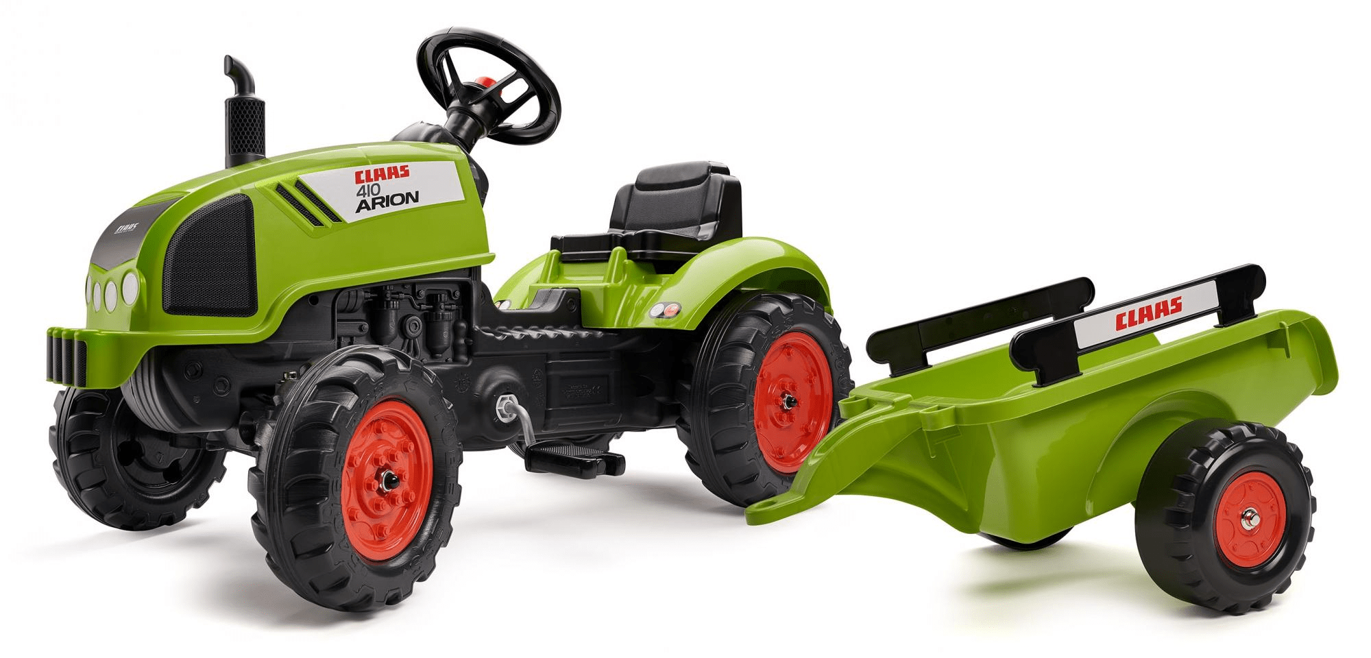 Traktor Claas Arion 410 s prikolicom ima poklopac motora, koji se otvara i ispušnu cijev. Mali traktorist može upravljati volanom i koristit trubu. Neka zabava počne! Cijeli opis