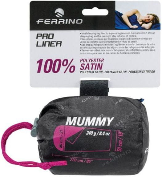 Podloga za vreću za spavanje Mumija FERRINO Pro Liner MUMMY. Materijal od vrlo laganog satenskog poliestera, džep za jastuk, bočni otvor. Cijeli opis