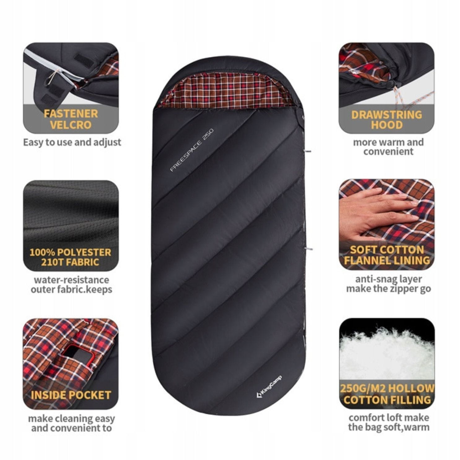 KingCamp Freespace 250 osmišljen je za korisnike koji žele više prostora nego u klasičnoj vreći za spavanje. Zahvaljujući većim dimenzijama i mogućnosti potpunog rasklapanja, odličan je izbor za kampiranje, putovanja kombijem ili kao praktična deka za odmor na otvorenom.