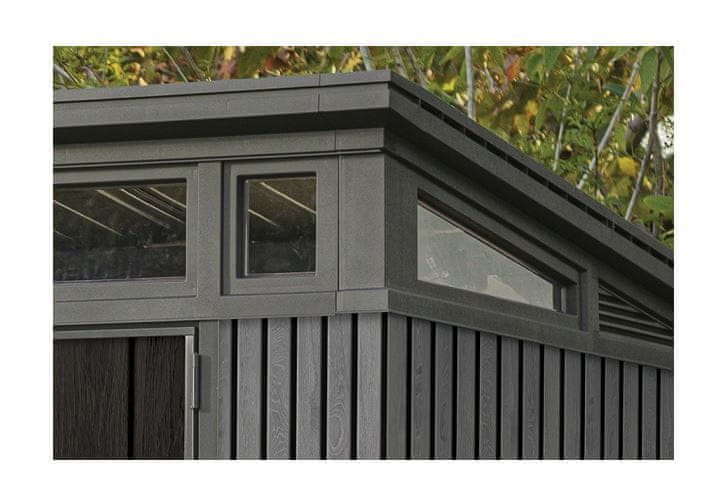 PENT 7×7 siva od tvrtke KETER. Dvostruki zid otporan na vremenske uvjete s čeličnim ojačanjem. Jedinstveni DECOCOAT zidovi. Široka dvostruka vrata, viktorijanski prozor i krovni prozori.