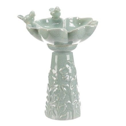 Keramička hranilica i pojilica u mentol nijansi dizajnirana je kao dekorativni dodatak vrtu ili terasi. Oblik cvijeta s fino modeliranim laticama nadopunjen je s dvije male figure ptica, koje doprinose vizualnom efektu i prirodnosti. Površina je glatka s finom glazurom koja olakšava održavanje. Stabilan stojeći oblik osigurava sigurno postavljanje na ravnu površinu. Pogodno kao izvor vode ili hrana za ptice za vanjsku i unutarnju upotrebu.