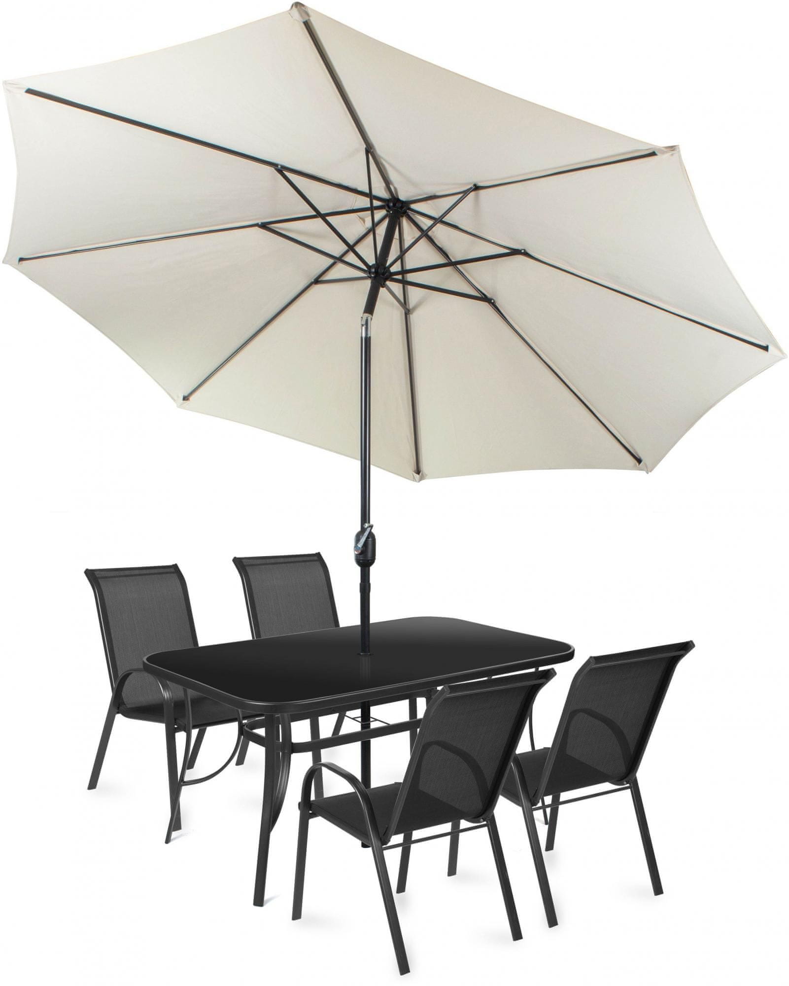 | Komplet sadrži | stol, 4 stolca, suncobran |