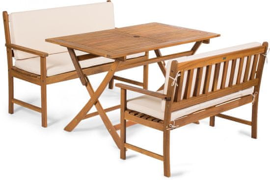 Set vrtni namještaj Emily izrađen je od kvalitetnog drva akacije. Stol i stolice su sklopive, što će uvelike olakšati vaše čišćenje i pohranu. Stol ima i prikladnu rupu za suncobran koji će vas zaštititi od sunca. Set sadrži jedan stol, dvije stolice i klupu za ugodne trenutke na svježem zraku.