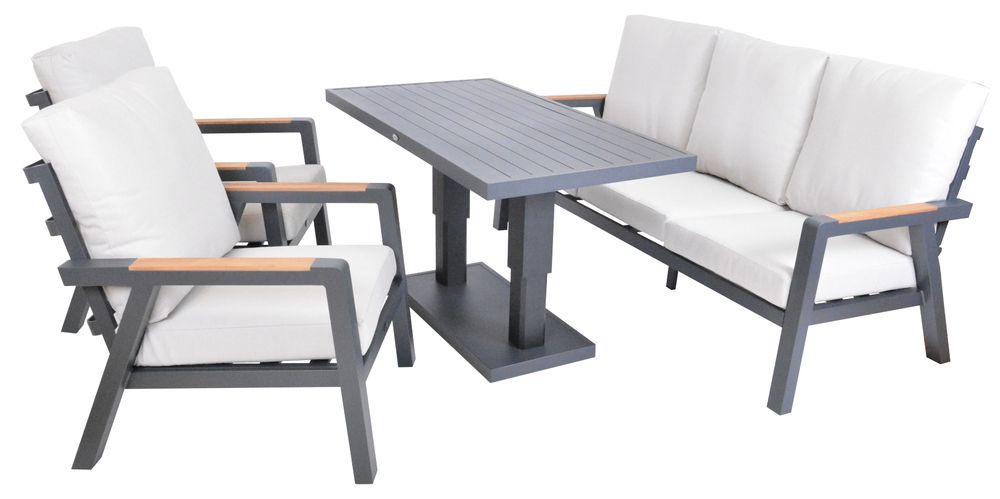 Luksuzni aluminijski set u grafitnom dizajnu, upotpunjen naslonima za ruke od tikovine. Set također uključuje aluminijski stol s podesivom visinom ploče. Zahvaljujući vrlo jednostavnim kontrolama, lako ga možete podesiti na željenu visinu. Stol možete koristiti kao blagovaonski stol ili ga spustiti kako biste stvorili konferencijski stol. Moderan set koji se savršeno uklapa u svaki eksterijer ili interijer. Udobni poliesterski jastuci (250g/m2) s punjenjem od pjene (10 cm) otporni su na UV zračenje. Svi jastuci opremljeni su patentnim zatvaračima, zahvaljujući kojima lako možete ukloniti poliestersku navlaku. Zahvaljujući korištenim materijalima i modernom izgledu, set ima zaista širok raspon upotrebe, pogodan je za unutarnje i vanjske prostore – vrtove, terase, zimske vrtove ili možda dvoranu za dobrodošlicu ili prijem. Zahvaljujući jednostavnoj montaži, nakon nekog vremena moći ćete u potpunosti koristiti set. STOL ima 2 položaja visine – 51 cm i 77 cm
