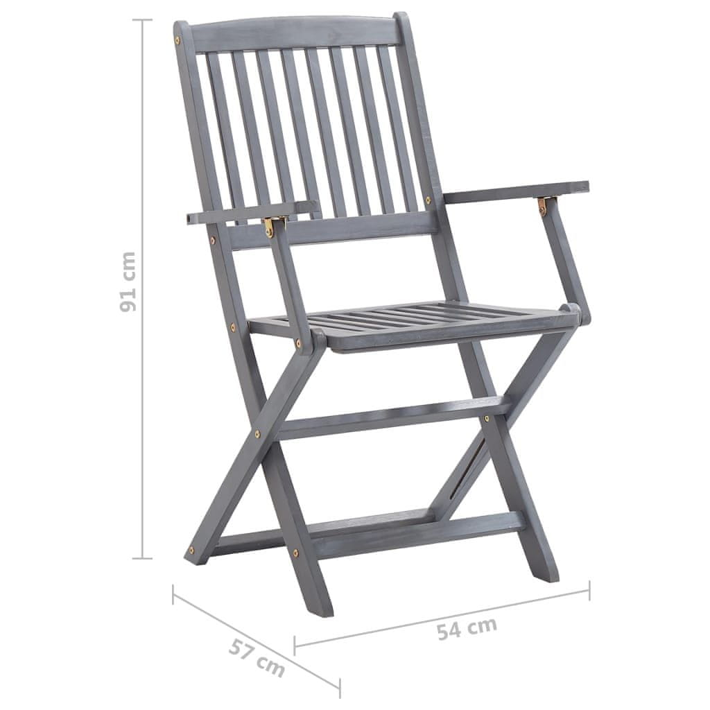 Ovaj suvremeni set drvenih blagovaonskih stolica s jastucima dodaje dašak prirodnog stila vašem vrtu, terasi ili dvorištu. Set sklopivih stolica izvrstan je izbor za objedovanje. Ove blagovaonske stolice napravljene su od masivnog bagremovog drva, tropskog tvrdog drva, zbog čega su o Cijeli opis