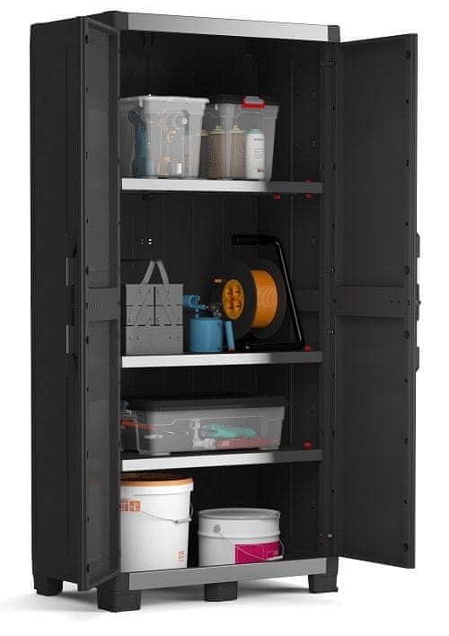 Plastični ormari serije XL GARAGE ističu se savršenim dizajnom, jednostavnom montažom, ojačanom konstrukcijom i povećanom nosivošću polica! Ormari XL GARAGE pružaju više od osnovne opreme: pomične police zahvaljujući SLO sustavu, nosivost polica do 45 kg, ojačano dno s dodatnom središnjom nogom, mogućnost zaključavanja lokotom i optimalne ručke. – police se lako podešavaju – opremljene nogicama s lokotom – 3 police nosivosti 45 kg! – ojačano dno – noge podesive po visini – središnja noga za veću stabilnost – metalne šarke – jednostavno čišćenje poda ispod ormara zahvaljujući podignutim nogama – pogodno za radionice, garaže, operacijske hale, ali i za natkrivene terase ili vrtne kućice