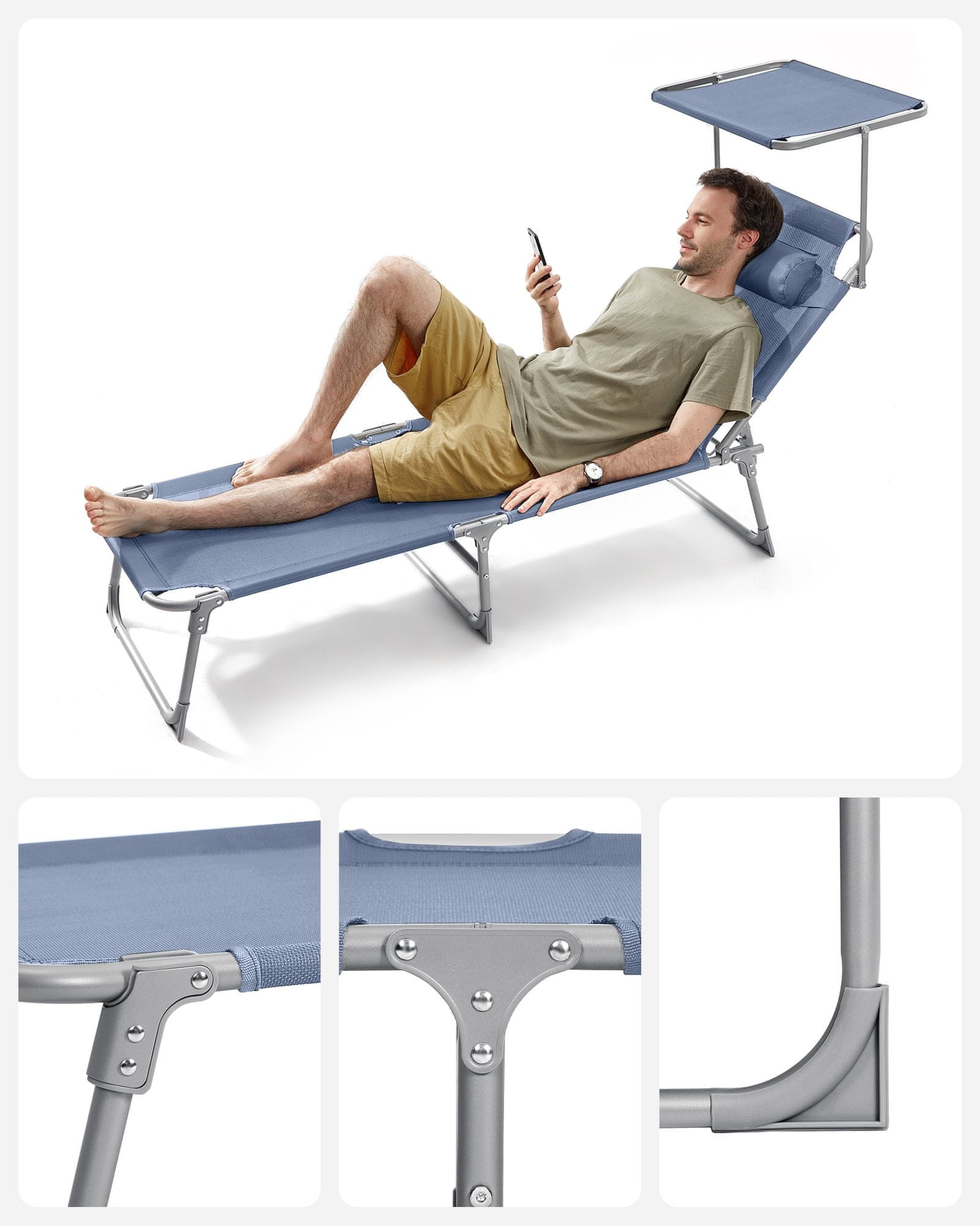Ova ležaljka za sunčanje dizajnirana je za opuštanje na otvorenom bilo u vrtu na balkonu ili uz bazen. Ima podesivi naslon za leđa naslon za glavu i zaštitu od sunca za udobnost i hladovinu. Lagan i sklopiv dizajn olakšava transport i pohranu.