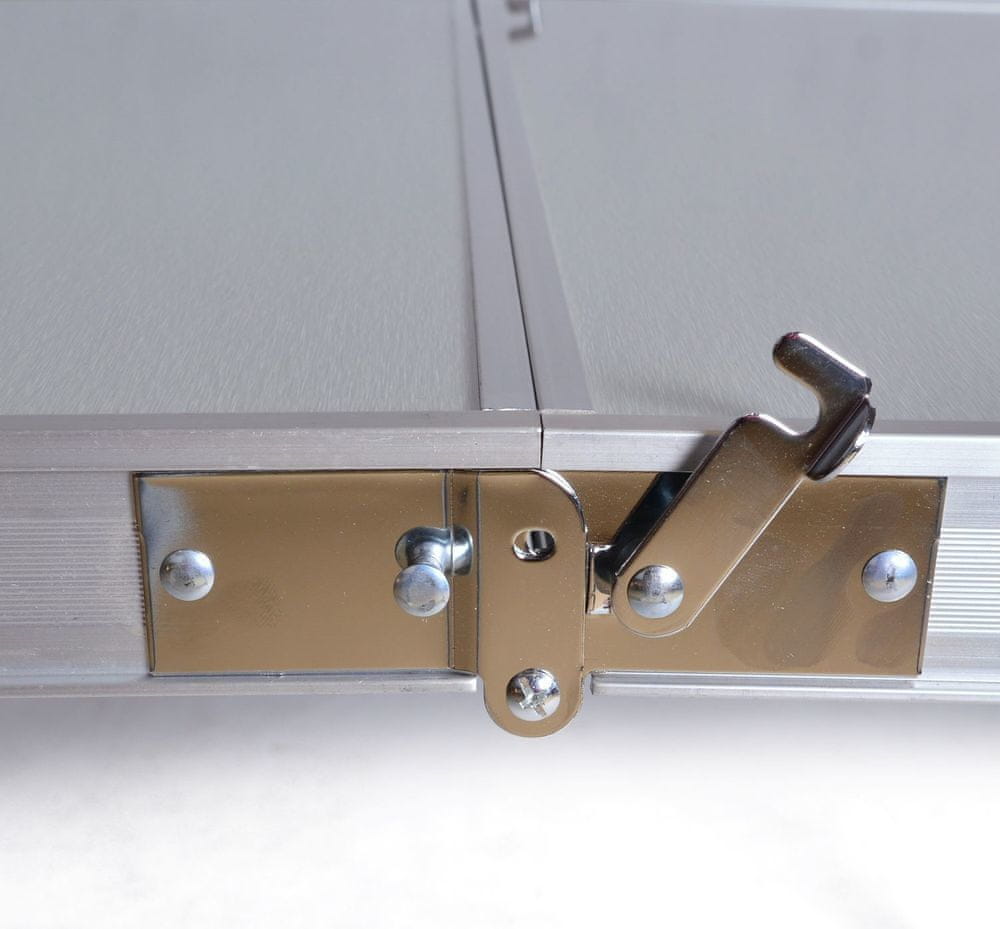 Sklopivi kamperski stol s pločom od 4,5 mm (MDF ploča obložena plastikom), svijetlo sive boje, srebrna aluminijska konstrukcija. Nakon sklapanja, dimenzije su 80×40×10cm