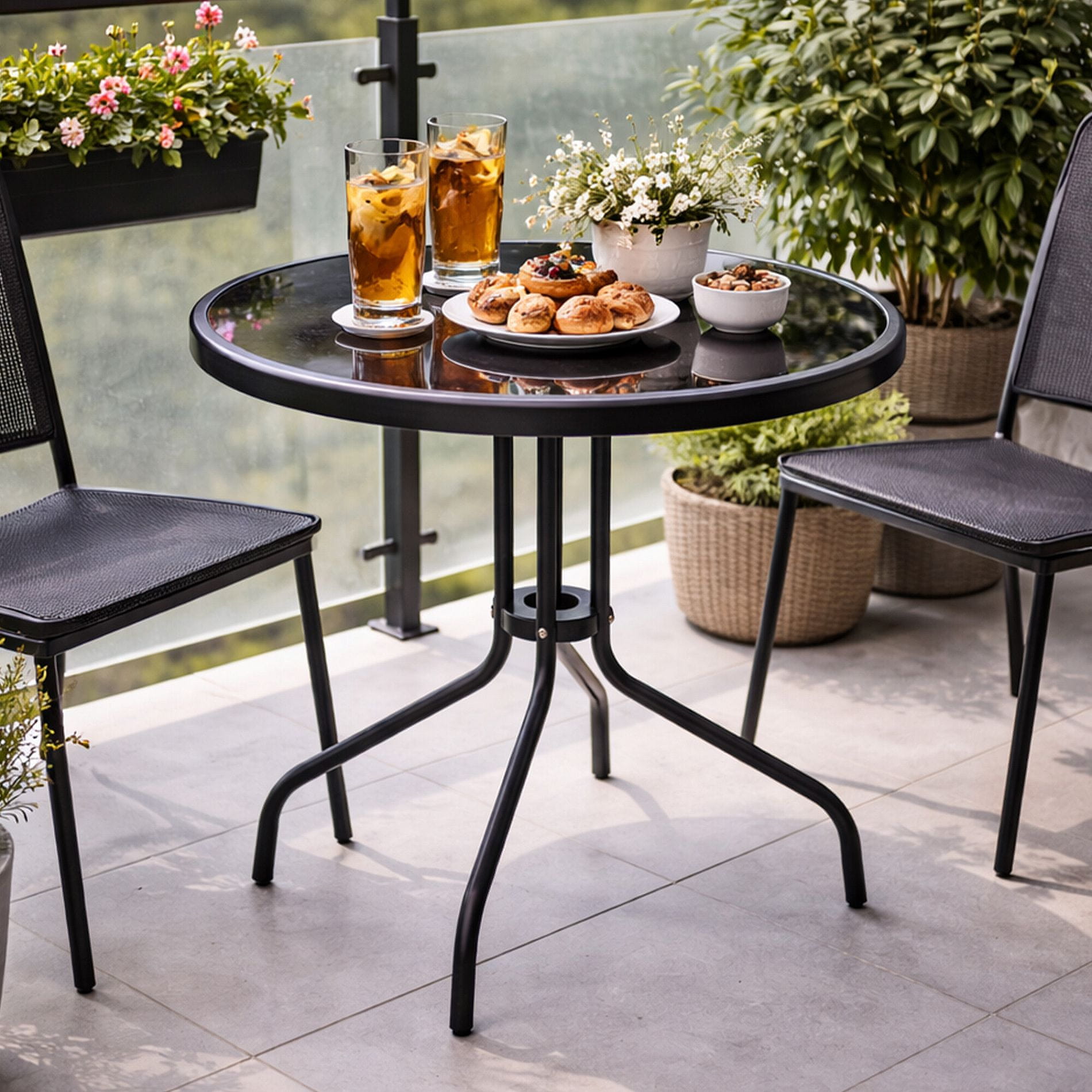 Vrtni stol s čvrstim metalnim okvirom i staklenom pločom u modernom dizajnu, pogodan za vrtove, terase, kafiće, sjenice, balkone ili plaže.