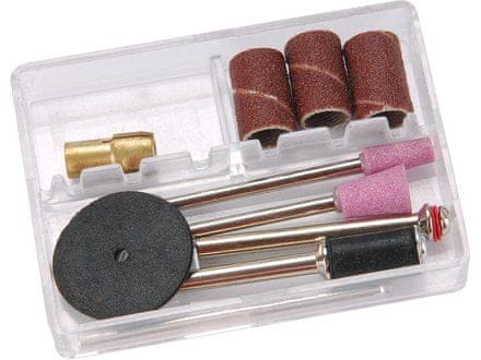 Minibruska je určena k jemnému broušení,odhrotování, frézování, jemnému vrtání a gravírování. Nářadí umožňuje výměnu a montáž upínacích kleštin pro uchycení nástrojů s průměrem stopky 2,3 nebo 3,2mm. Součástí balení je sada 10kusů brusných a řezacích nástrojů a nástavců.