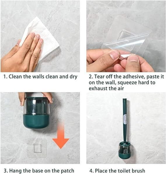 Instalacija je laka. Jednostavno zalijepite kuku na glatku površinu i pričvrstite držač četke. Ergonomska ručka čini čišćenje učinkovitijim i skraćuje vrijeme čišćenja.