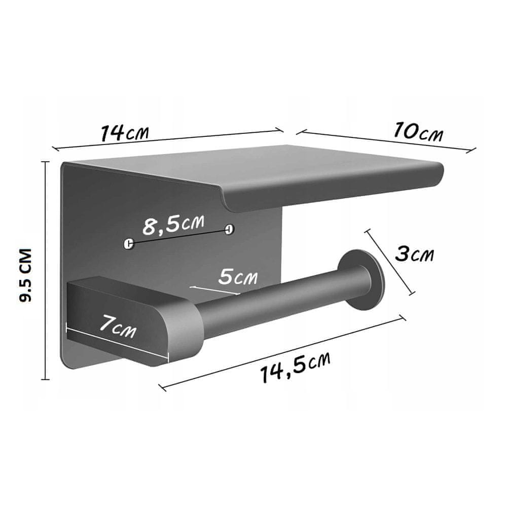 Zidni držač toaletnog papira s policom: Moderan dizajn i mat siva čelična konstrukcija otporna na koroziju. Praktična polica za telefon ili sitnice. Dimenzije 14×10×9.5 cm. Funkcionalnost i elegancija za svaku kupaonicu.