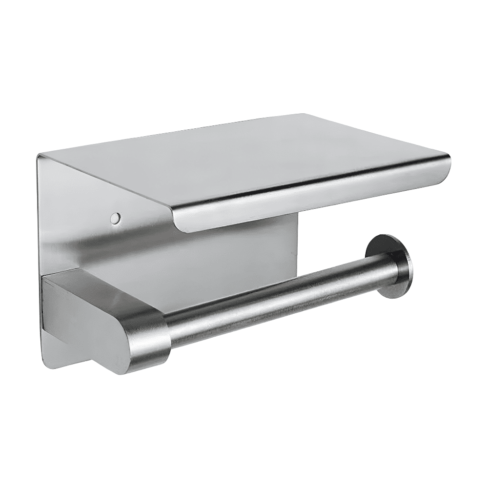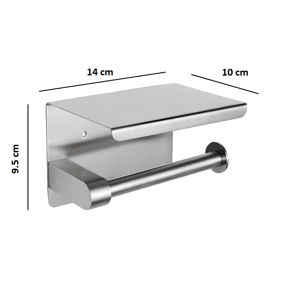 Zidni držač toaletnog papira s policom: Moderan dizajn od nehrđajućeg čelika (srebrno brušeni) za trajnost i otpornost na koroziju. Praktična polica za telefon ili sitnice. Dimenzije: 14×10×9.5 cm.
