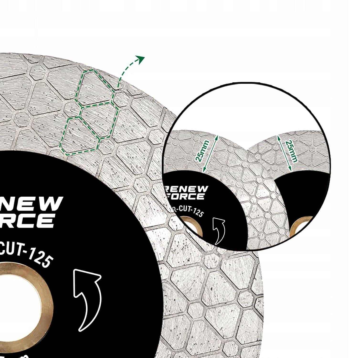 – Debelina diamantnega nasipa: 2,5 cm na obeh straneh diska