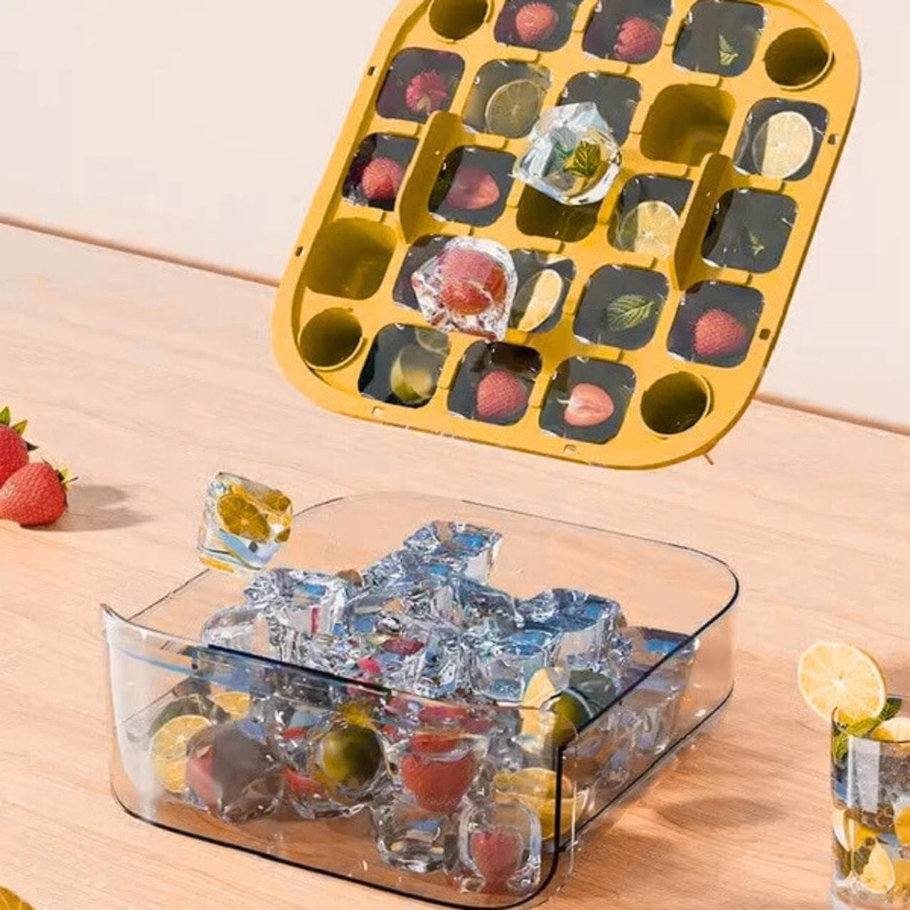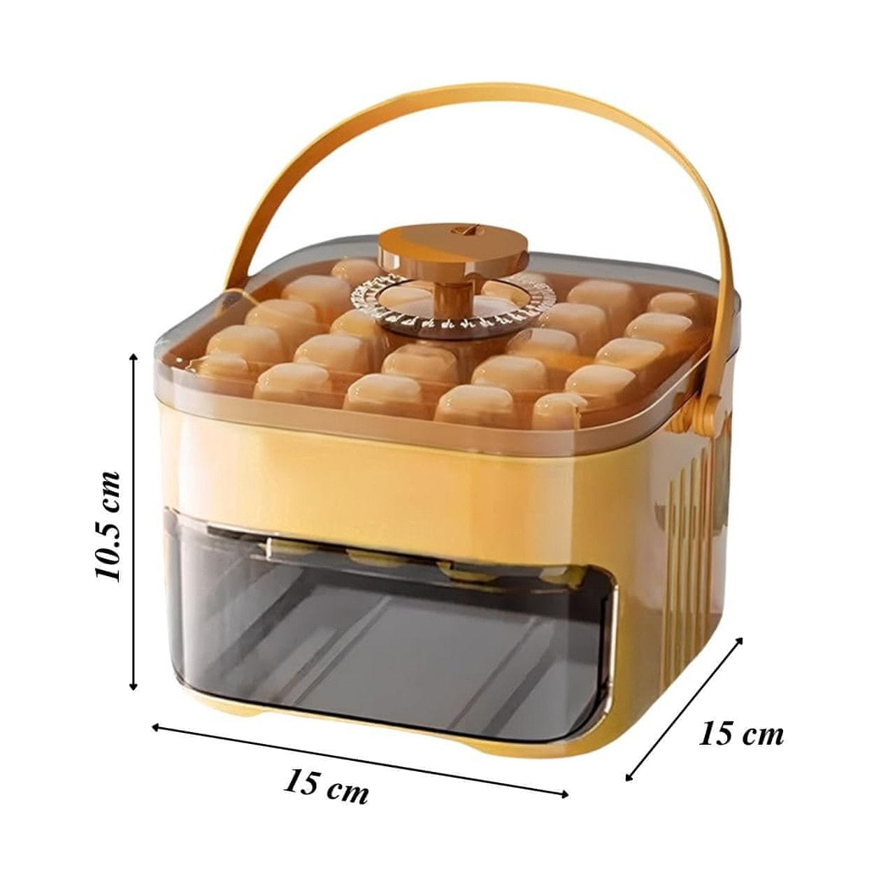 Ulijte vodu u unutarnji spremnik, zatvorite poklopac i stavite u zamrzivač dok se ne formiraju kockice leda. Kada su spremne, pritisnite gumb na vrhu – led će pasti u donji spremnik. Čuvati dalje od izravne topline. Prije prve uporabe preporučuje se pranje.