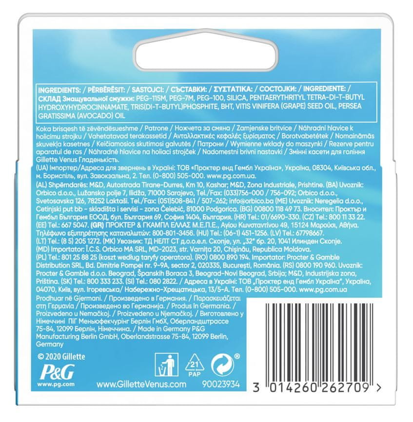 Ženske Venus zamjenske oštrice jamče potpuno brijanje i glatku kožu kao svila. Oštrice imaju meke trakice koje nježno glade vašu kožu. Britvica ima zaobljenu glavu koja nudi jednostavan dostup do teško dostupnih mjesta. Vlažna trakica obogaćena je prirodnim uljima koji vlaže i mekšaju kožu.