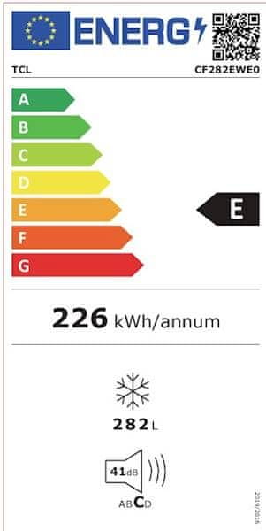 Zamrzivač TCL CF282EWE0 ima kapacitet od 282 l. Spada u E klasu energetske učinkovitosti i troši 226 kWh energije godišnje.